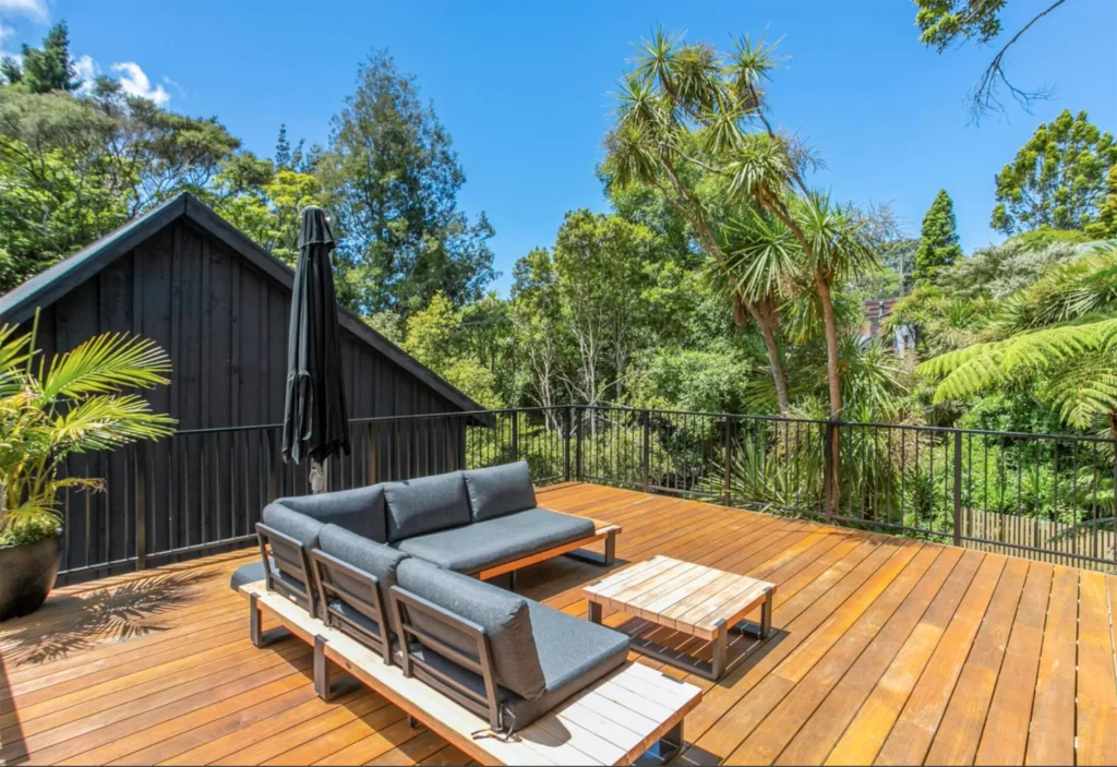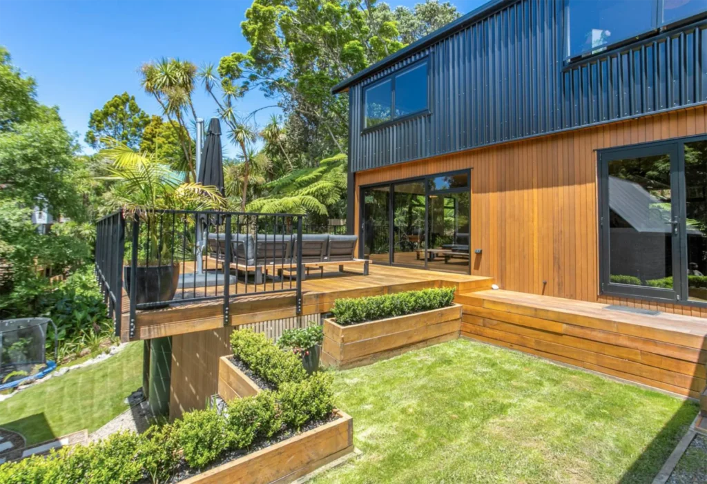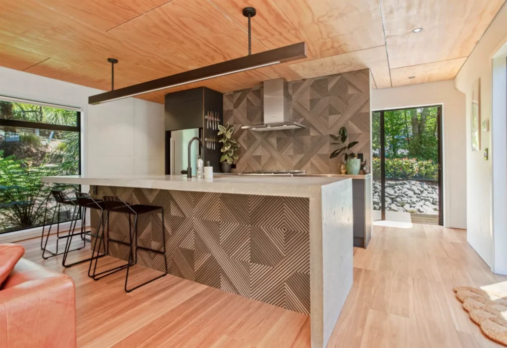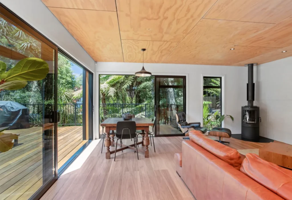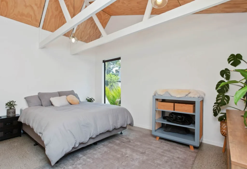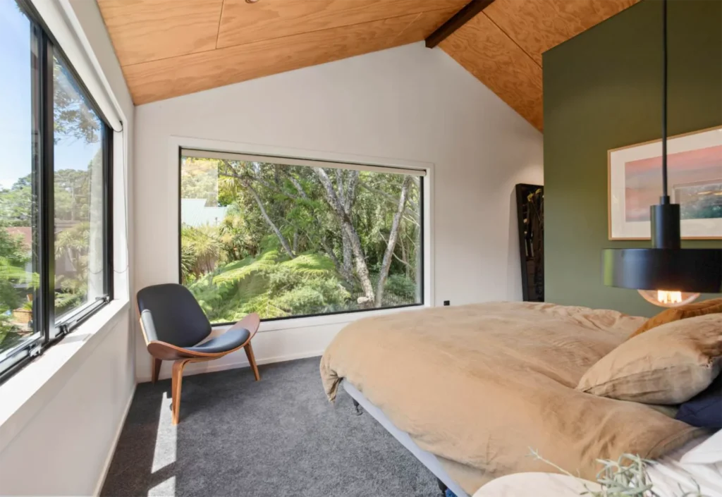 Long run iron cladding, ply ceiling linings, overlay composite flooring and a simple yet interesting design helped keep this home to budget. The living amongst the trees feel in the master bedroom is our favourite part of this project.