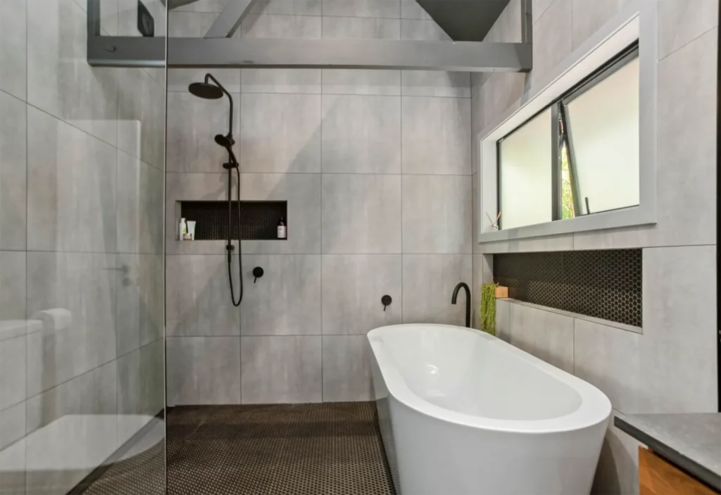 The small single story part of the house was an old leaky shack which was renovated to become the guest bedroom and bathroom. While the two level building was completely new. These married well together to create a 3 bedroom family home, with loads of entertaining areas that has settled well in to the bush.